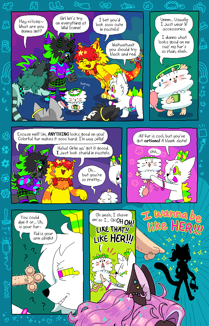 TranscriptBLUEZ: Hey niiicee~ What are you gonna get? PREENY: Ummm... Usually I just wear lil' accessories. ZOMG: Excuse me!!! Um, ANYTHING looks good on you! Colorful fur makes it sooo hard. I'm way jelly! YELLOW: All fur is cool, but you've got options! A blank slate! YELLOW: You could dye it or... Uh, is your fur- PREENY:Oh, yeah, I shave 'em so I... OH OH OH! LIKE THAT!! LIKE HER!!! PREENY: I wanna be like HER!!! |