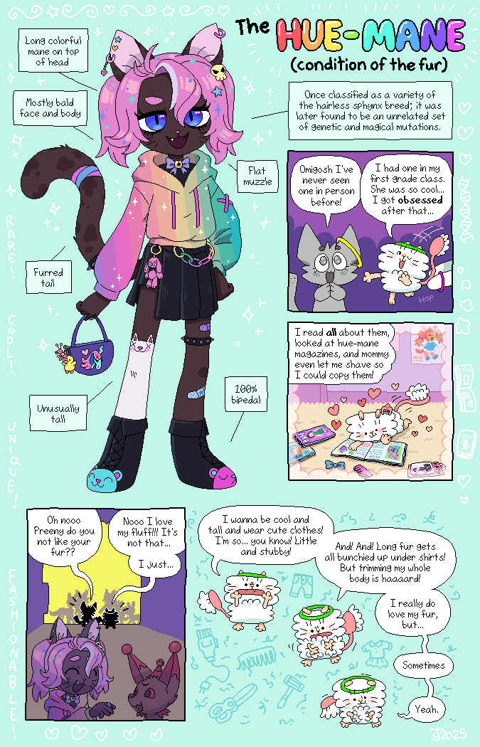 TranscriptTEXT: The HUE-MANE (condition of the fur) TEXT: Long colorful mane on top of head MASON: Omigosh I've never seen one in person before! PREENY: I read all about them, looked at hue-mane magazines, and mommy even let me shave so I could copy them! MASON: Oh nooo Preeny do you not like your fur?? PREENY: I wanna be cool and tall and wear cute clothes! I'm so... you know! Little and stubby! PREENY: And! And! Long fur gets all bunchied up under shirts! But trimming my whole body is haaaard! PREENY: I really do love my fur, but... PREENY: Sometimes PREENY: Yeah. |